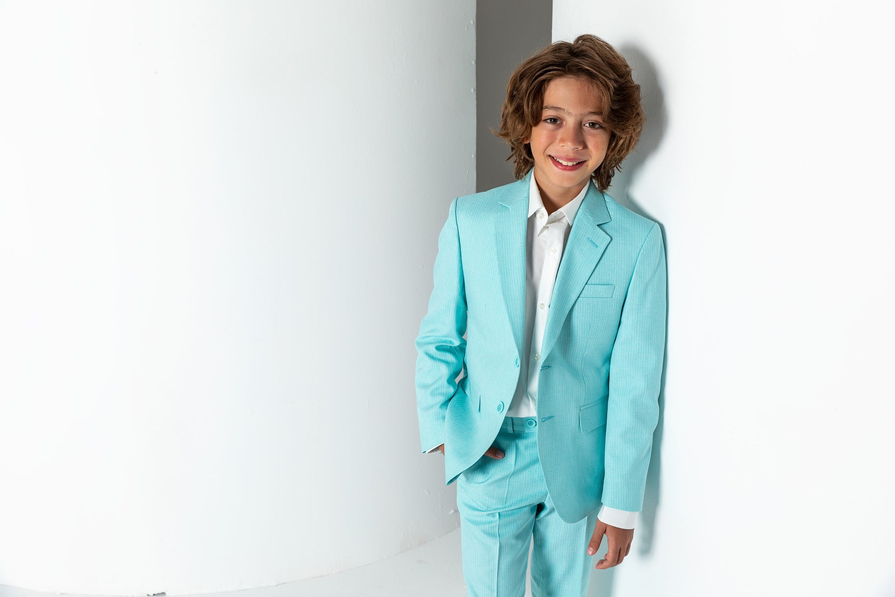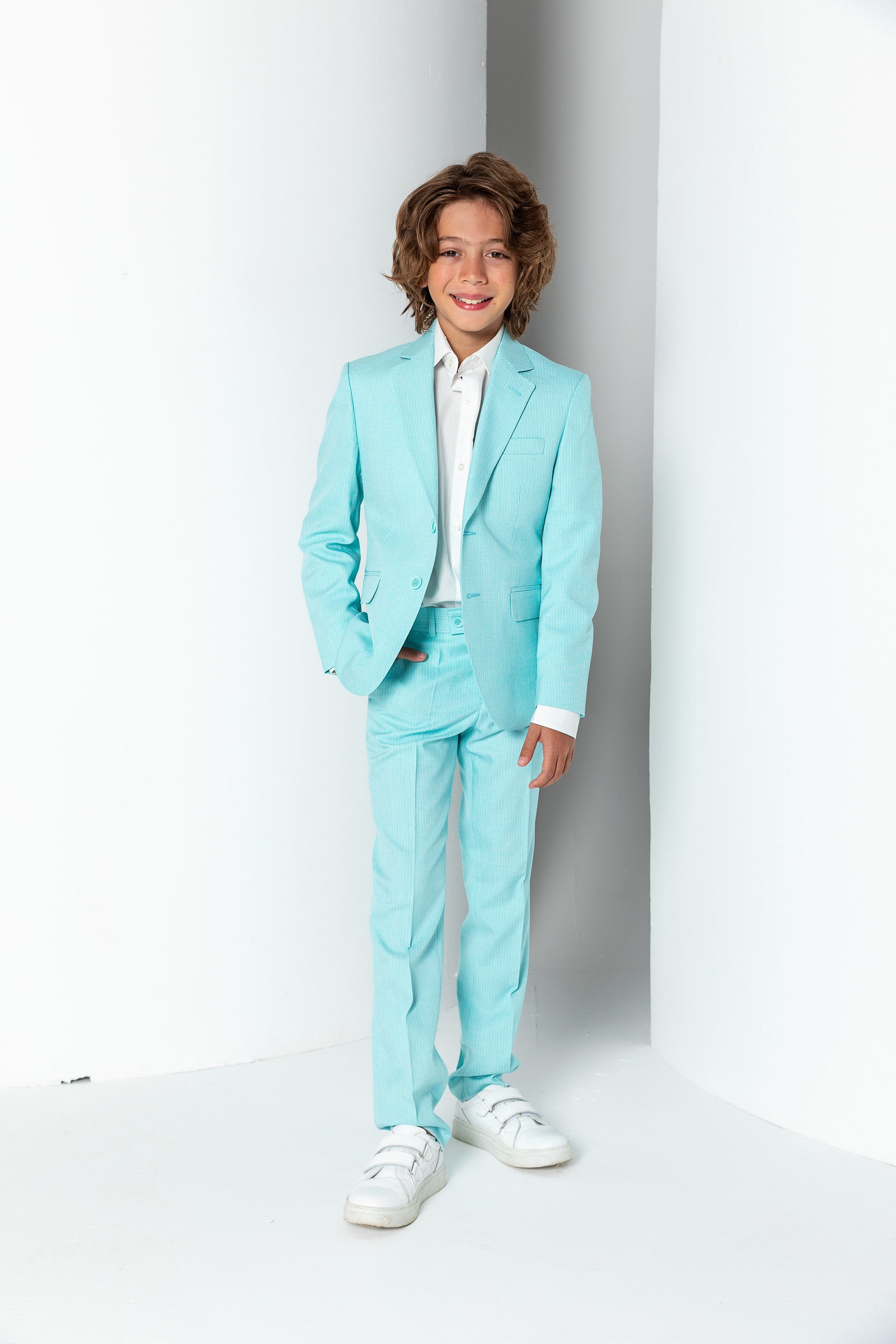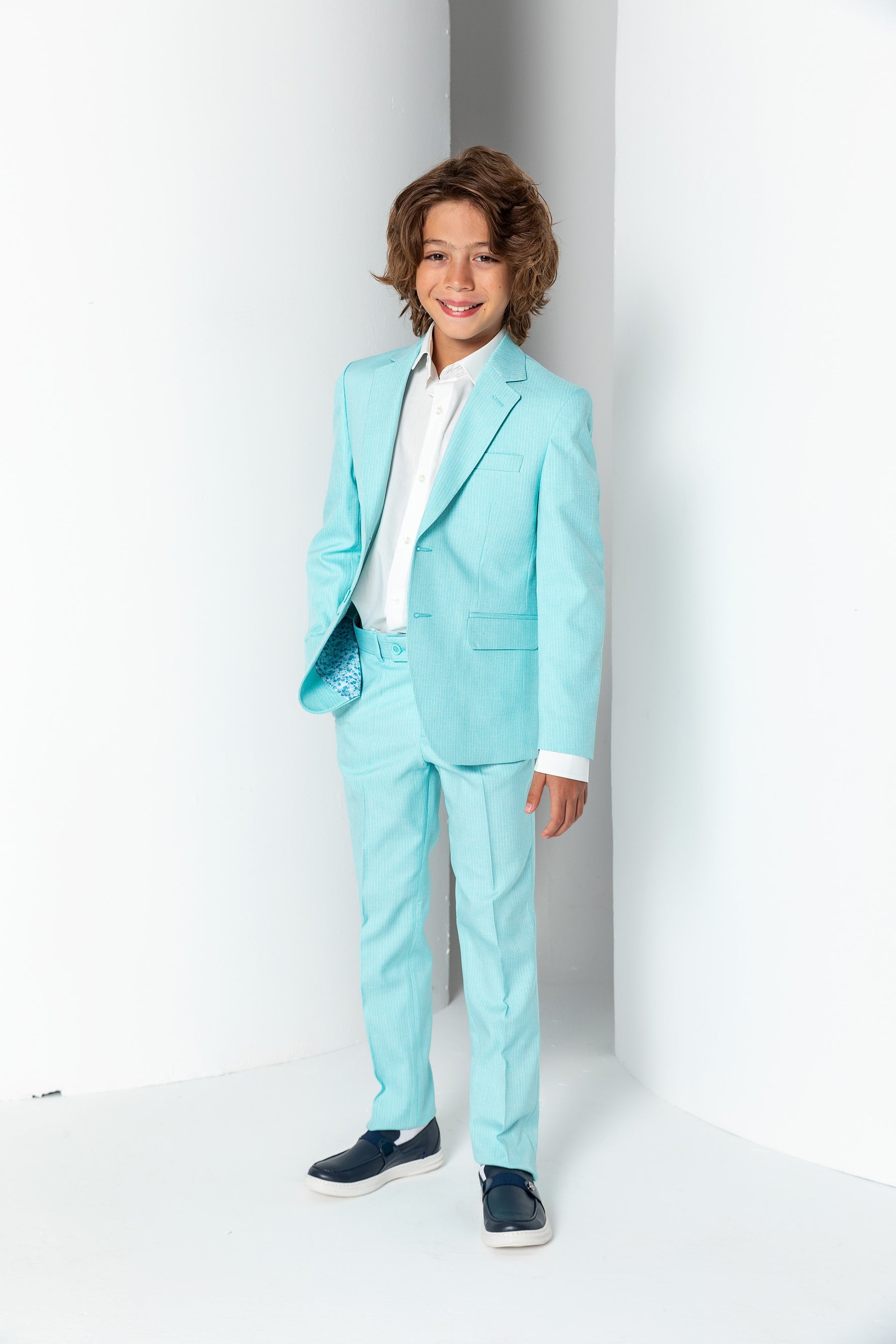 Erkek Çocuk İnce Çizgili İki Düğmeli Kapak Cepli Klasik Pantolonlu Takım Elbise - Mint Yeşili