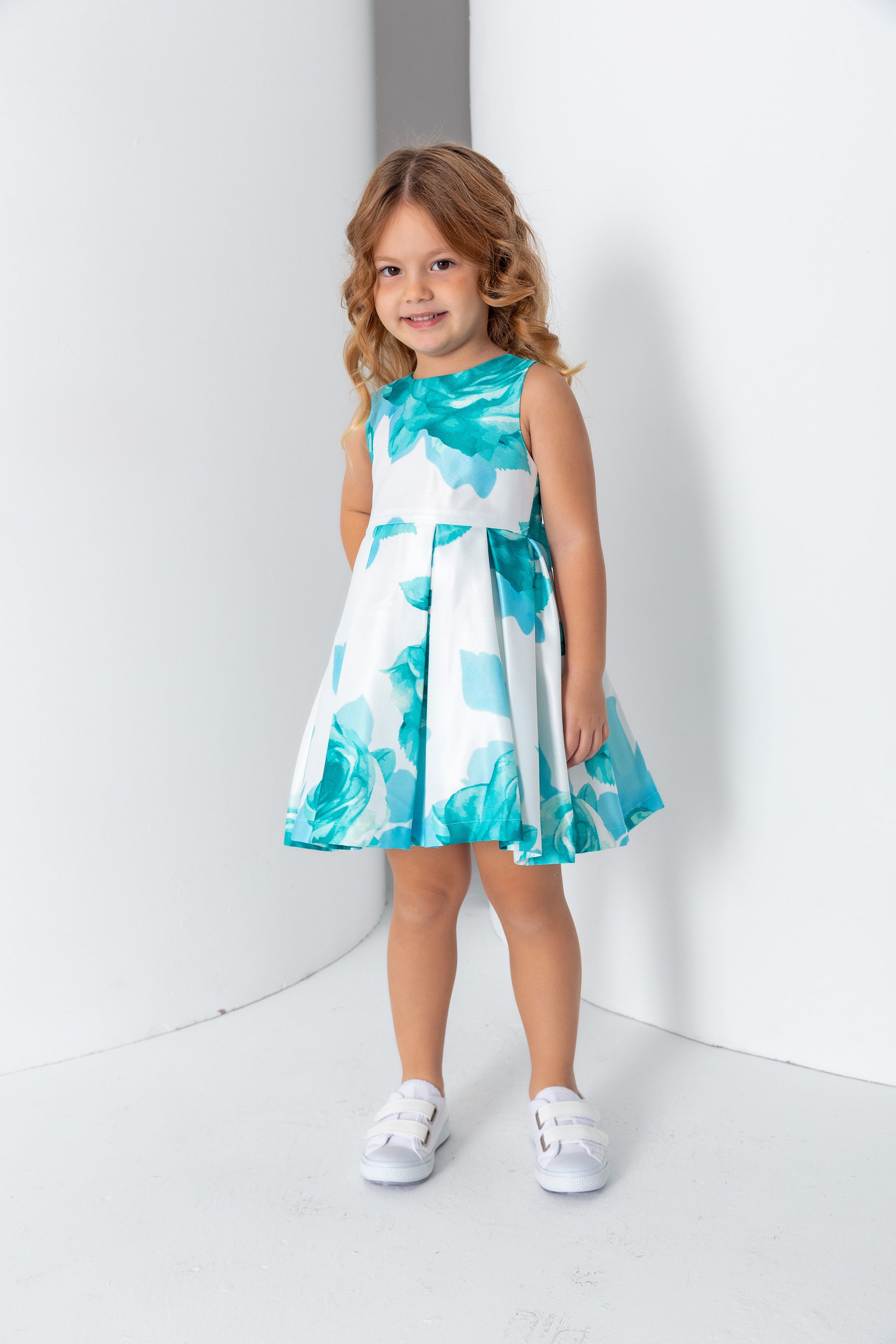 Kız Çocuk Bisiklet Yaka Sıfır Kol Çiçek Desenli Saten Elbise - Turkuaz/Mint
