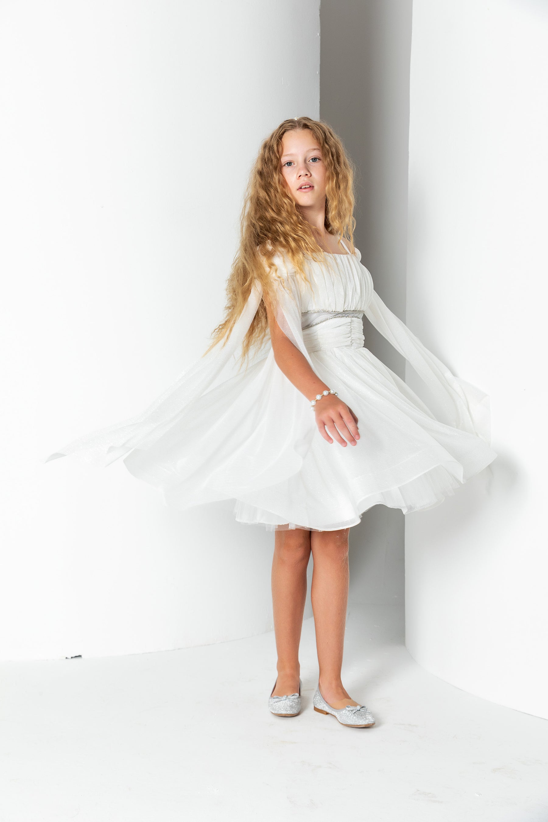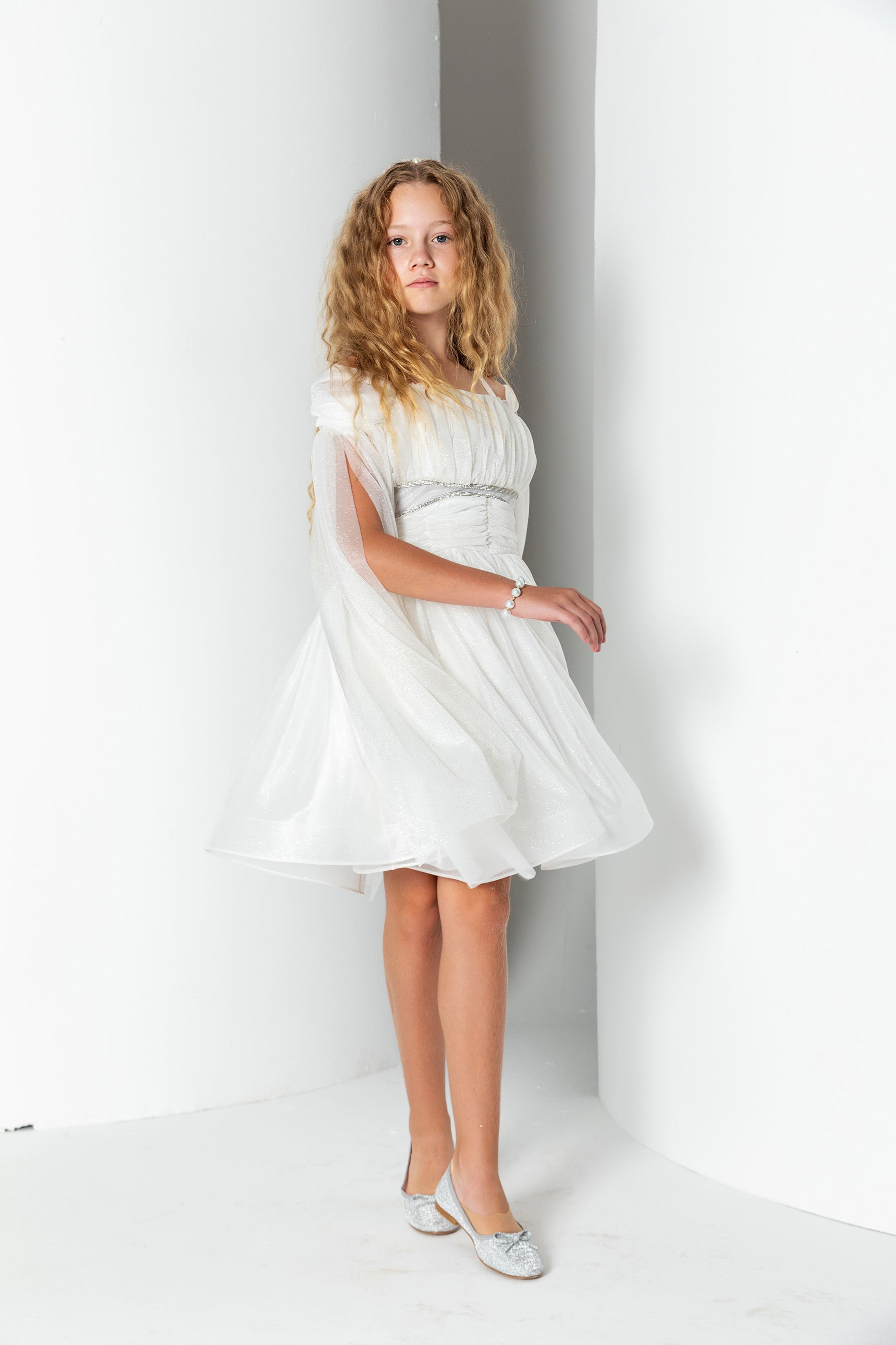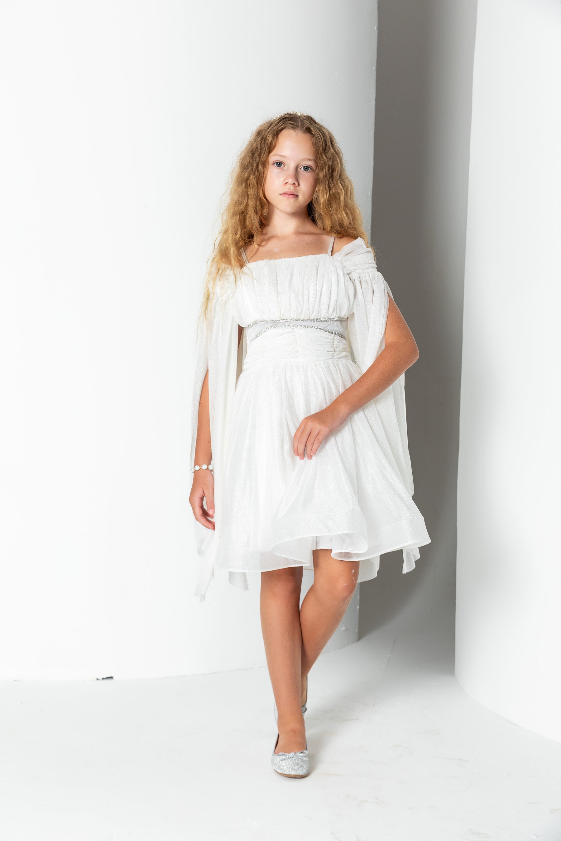 Kız Çocuk Sim Detaylı Taş Şeritli Pelerin Kol Abiye Elbise - Ekru